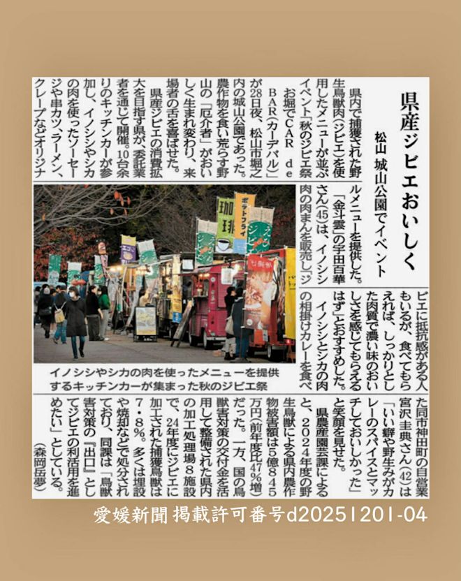 この企画以外の場所でも、独自にジビエ料理を出している店舗も少しずつ増えており、愛媛県産ジビエを楽しむ機会が今後ますます広がることが期待されます。