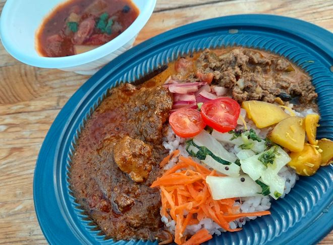 先日の湯築市で初めて愛媛県産ジビエを使ったというスパイスカレー店では、前回とはラッサムに使うソーセージの下処理の方法を変えてバージョンアップ。「前回は香ばしく炒めてから煮込んだが、少し食感が悪かったので、今回は茹でることでプリプリとした舌触りを楽しめるようにした。」冬瓜もプラスしてより風味の良いラッサムに仕上がっていました。猪肉モモ肉と鹿ミンチの2種のカレーをあいがけにしたプレートは彩りもよく、情報をききつけて駆け付けたというスパイスカレーファンはもちろん、多くの女性客にも好評でした。