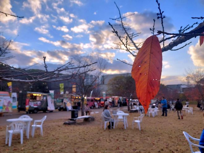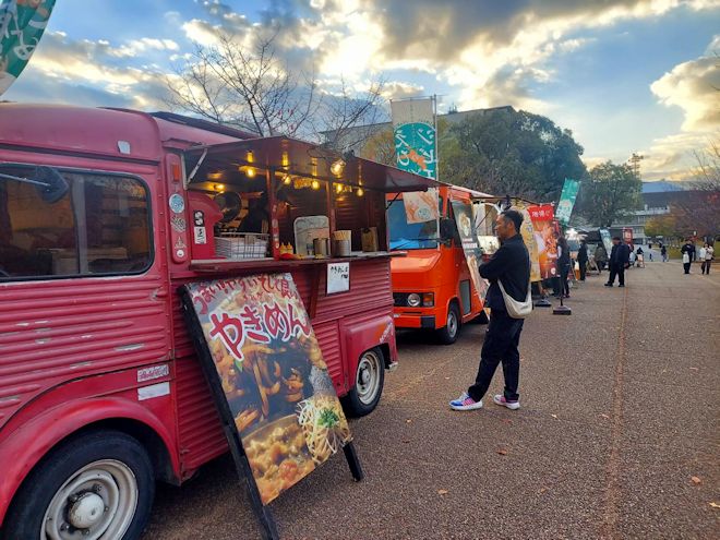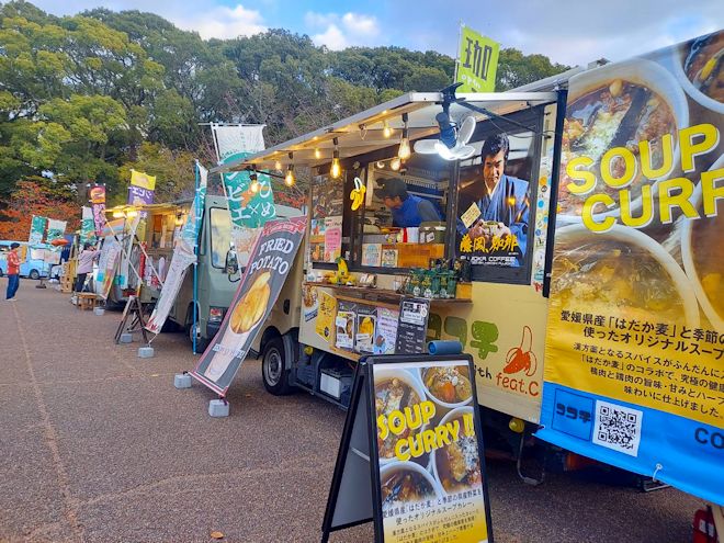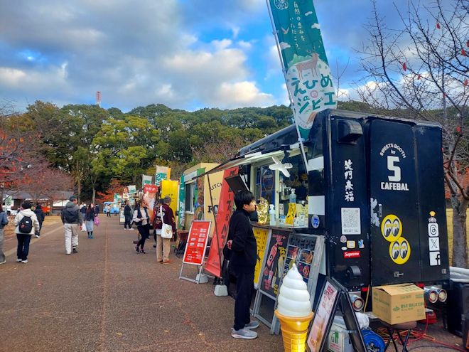 3年目となるキッチンカーイベント「ジビエ秋祭り」が今年も松山市城山公園で開催されました。この日は前日の雨も上がり、乾いた落ち葉が散る晩秋らしい天気となりました。この日は当初予定していた10店舗に加えて、急遽2店が加わって合計12店のキッチンカーが愛媛県産のイノシシ肉、鹿肉を使ったオリジナル料理を提供しました。